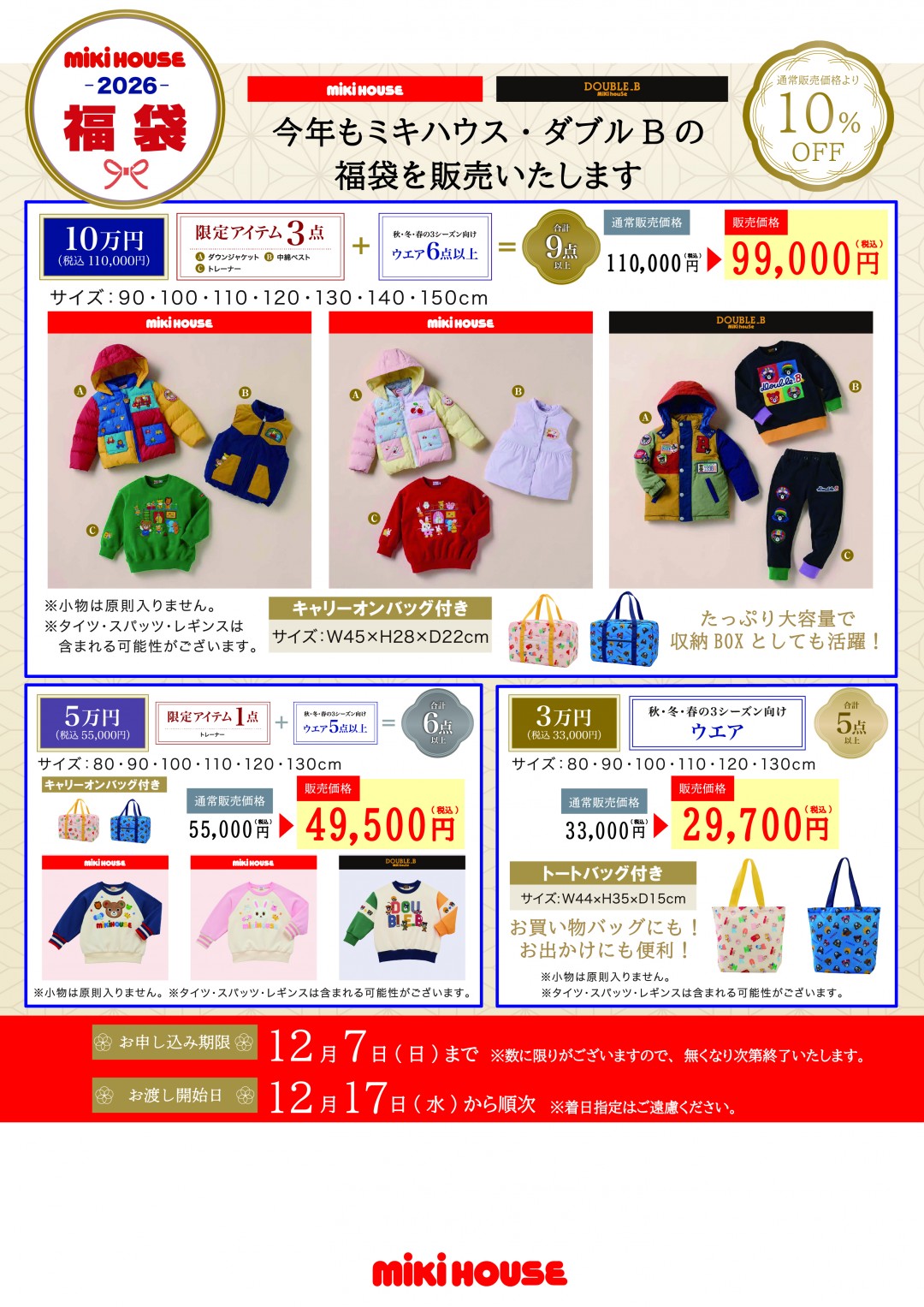 毎年ご好評をいただいております、ミキハウスの福袋予約が本日より開始されました。